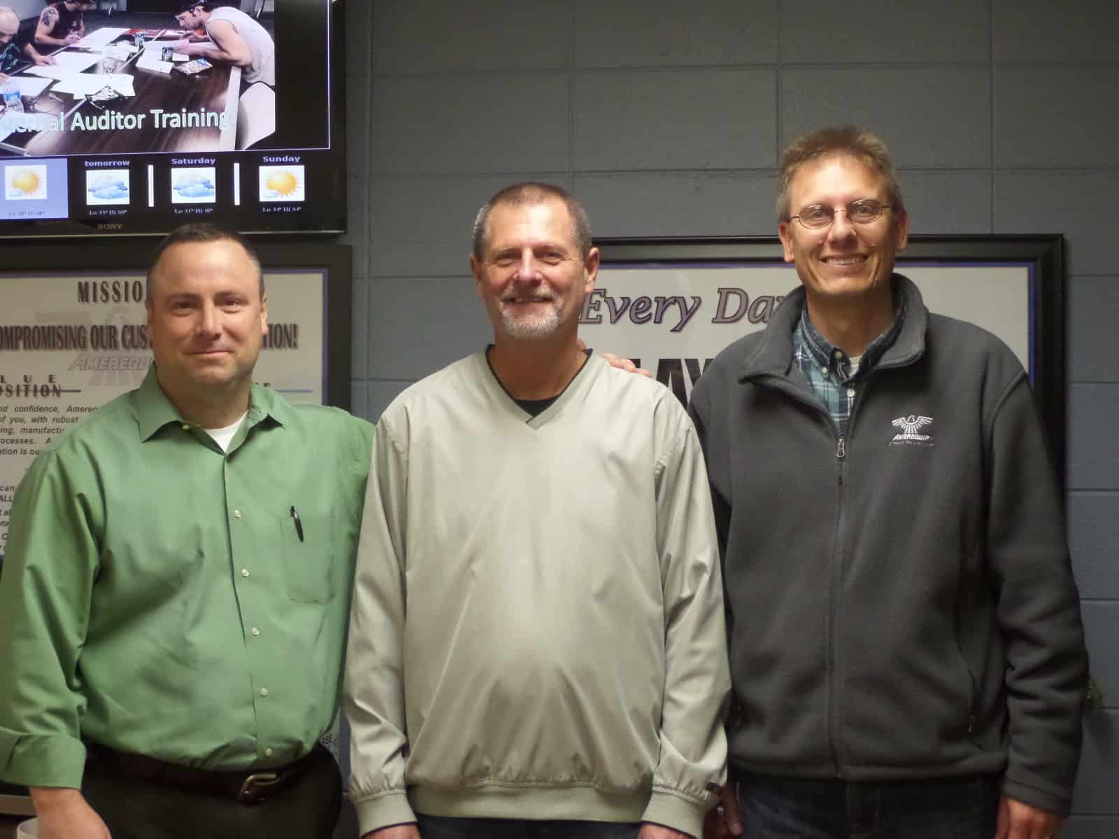 Dave Jochimsen (center) of New Holstein recently retired with 43 years of service at Amerequip. He was congratulated by VP Operations, Doug Thompson (left) and Plant Manager, Joel Mueller (right). Jochimsen worked in the cylinder assembly department.